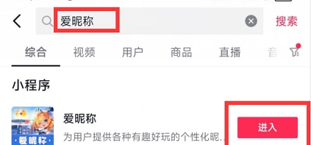 1、首先我们需要有最新版抖音app,打开app在搜索栏中输入爱昵称小程序,点击进入搜索结果。