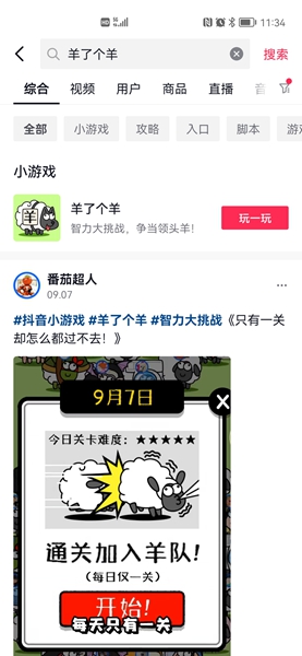 2、玩家也可以打开抖音,在这里搜索羊了个羊,然后在线玩。
