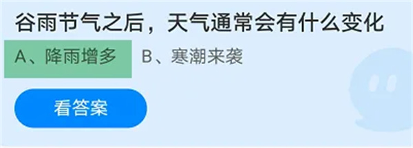在支付宝中有个蚂蚁庄园,用户每天在这里进行答题即可获得饲料进行喂养小鸡,今天是4月20日,今天的问题是谷雨节气之后,天气通常会有什么变化?答案是降雨增多,题目解析为谷雨节气之后寒潮天气基本结束,气温回升显著,另外降雨增多并且雨量充足,有利于谷类农作物的生长,所以有俗话说“雨生百谷”。谷雨时节是我国很多地区采摘茶叶的时候,用来制作“谷雨茶”。